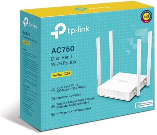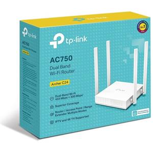Archer C24 je základní a velmi kompaktní AC750 Dual-Band router značky TP-Link, který obsahuje 4x 10/100Mbps LAN, 1x 10/100Mbps WAN a 4 fixní antény. Bezdrátová část umí pracovat ve dvou pásmech zároveň a to rychlostí 300Mbps ve 2.4GHz pásmu a 433Mbps v pásmu 5GHz. Router podporuje IPv4 i nejnovější IPv6 routování. Router kromě nejvíce používaného modu AP Router podporuje i režimy Access point a Range Extender.