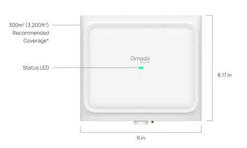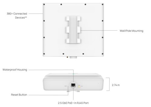 Hardwarové specifikace *Rozhraní: 1× 2.5G Ethernet (RJ-45) Port (Support 802.3at PoE) *Tlačítko: Reset *Napájení: 802.3at PoE *Max. spotřeba energie: 21.5W (for PoE) *Rozměry (Š × H × V): 9.1× 8.2 × 2.8 in (230 × 207.5 × 69.7 mm) *Antény: Vestavěné směrové antény: