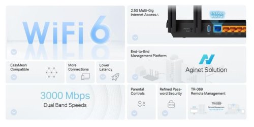 Konektory: *1× 10/100/1000/2500 Mbps RJ45 WAN Port *4× 10/100/1000 Mbps RJ45 LAN Ports *1× USB 3.0 Port
