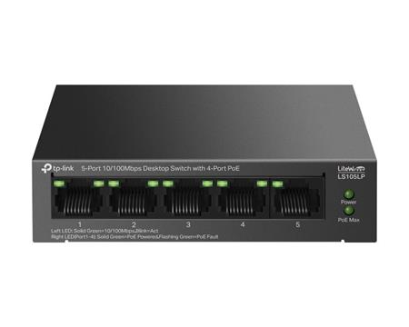 Switch TP-Link LS105LP je vybavený celkem pěti 10/100 Mbps LAN porty. Z toho má 4 PoE+ porty, které jsou kompatibilní se standardem 802.3af. Pomocí kabelu současně přenášíte data a napájíte zařízení s výkonem 15,4 W na každý PoE port. Celkový výkon dosahuje hodnoty až 41 W. Switch tedy snadno připojíte k IP kamerám, přístupovým bodům, IP telefonům a dalším zařízením.