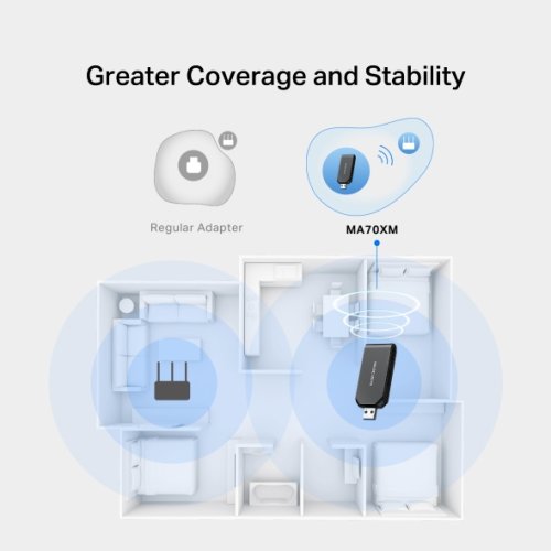 Adaptér MA70XM s technologií Wi-Fi 6 nabízí dvoupásmovou rychlost až 1201 Mb/s (5 GHz) a 574 Mb/s (2,4 GHz). Díky internímu ovladači jej snadno připojíte bez nutnosti instalace ze složitých zdrojů nebo CD.