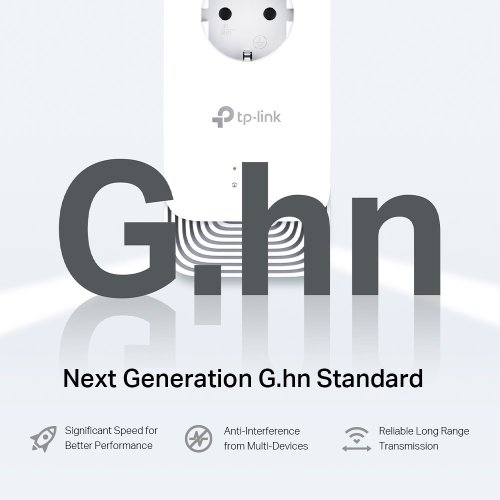 Pokročilý protokol G.hn MIMO Plug & Play Až 300 m po stávajícím elektrickém vedení 2+2 gigabitové ethernetové porty Přídavná napájecí zásuvka Neztrácejte zásuvku Režim úspory energie