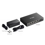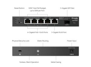 Hardwarové parametry: *Rozhraní: 4× 10/100/1000 Mbps PoE+ RJ45 Ports 1× 10/100/1000 Mbps RJ45 Port 1× Gigabit SFP Slot *Počet ventilátorů: Bez ventilátorů *Instalace: stolní, na zeď *Fyzický bezpečnostní zámek: Ano *Napájení: 53.5 VDC / 1.31 A *Rozměry (Š × H × V): 6.2 × 4.0 × 1.0 in (158 × 100.7 × 25.4 mm)