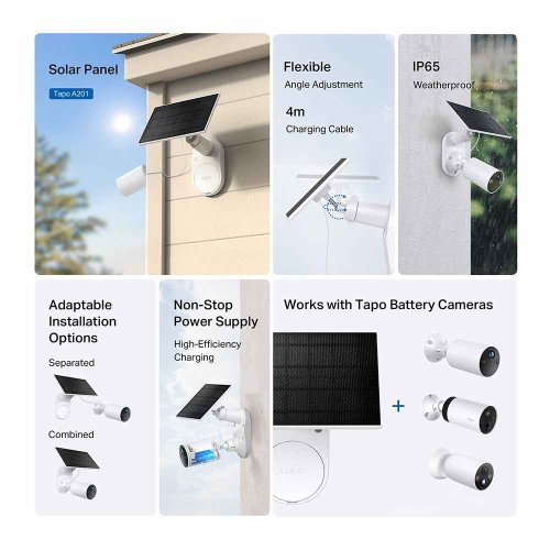 Funguje s bateriovými kamerami Tapo - Kompatibilní se všemi bateriovými kamerami Tapo1, což umožňuje celoroční ochranu vaší bateriové kamery Tapo.