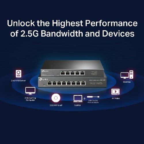 Firma TP-Link přichází s novou řadou Multi Gigabitových switchů, které dokážou navázat až 2.5Gbps link na každém portu. Tento základní model TL-SG108-M2 bez managementu v kovovém šasi má má celkově 8 metalických portů s rychlostí 100M/1G/2.5G, indikační LED na každém portu a jeden DC konektor pro napájení switche na zadní straně.
