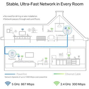 HomePlug AV2 Standard 3 gigabitové porty Konfigurace Wi-Fi jedním dotykem Plug and Play Dvoupásmová Wi-Fi AC1200 Rychlost až 867 Mb/s na 5 GHz a 300 Mb/s na 2,4 GHz