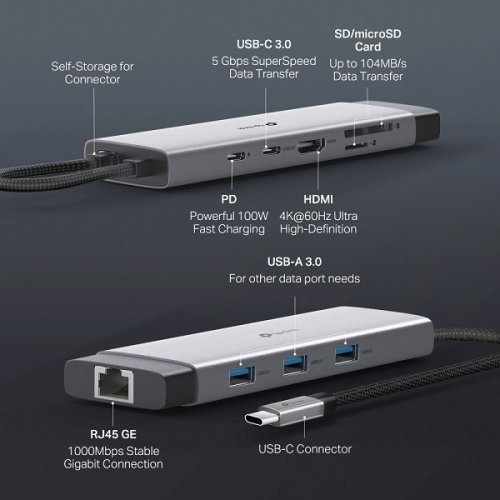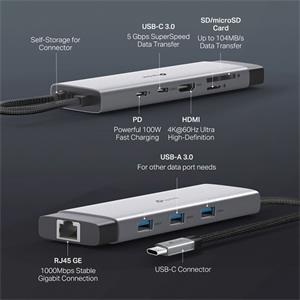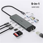 Hub USB-C 9 v 1: UH9120C mění jeden port USB-C na 9 portů s HDMI 4K při 60 Hz, ethernetem 1 Gb/s, SD a microSD UHS-I, 100W napájení, 1× datový port USB-C, 3× datový port USB-A.