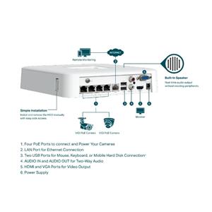Na záznamovém zařízení najdete čtyři 10/100 Mb/s PoE+ porty. Každý z nich má výkon 30 W. Celkový PoE výkon switche dosahuje 53 W. Pomocí jediného ethernetového kabelu přenáší data i napájení. Nepotřebujete tedy žádný další napájecí adaptér.