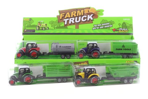 Kovový traktor s plastovým valníkem na zpětný chod. Baleno v plastové krabičce. Rozměry balení 18x4x5 cm. Věk 3+
