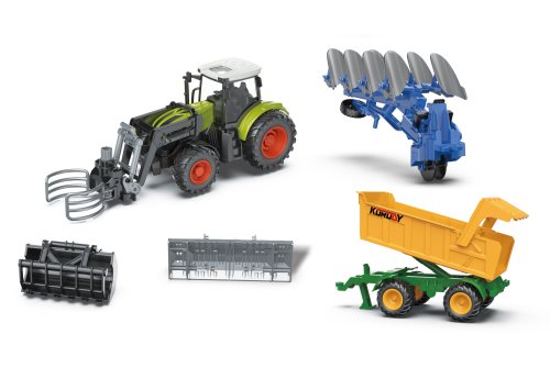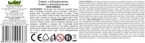 Traktor nakladač s efekty a příslušenstvím. Velikost traktoru 29 cm. Volná kola. Světelné a zvukové efekty stlačení přední části traktoru. 3xAG13 baterie součástí. Součástí 3 přípojná zařízení (1 přední, 2 zadní).
