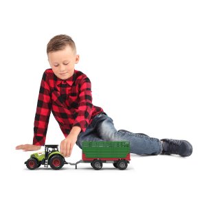Moderní plastový traktor s vlečkou na seno, hračka z kolekce Moje malá farma. Nepostradatelný pomocník pro každého malého farmáře! Vlečku můžeš jednoduše odpojit a traktor využít k dalším pracím. Traktor jezdí na setrvačník a jeho délka včetně přívěsu je 37 cm. Zmáčknutím tlačítek traktor vydává reálné zvuky. Traktor vyžaduje 3 ks baterií typu AG13/LR44, které jsou součástí balení.