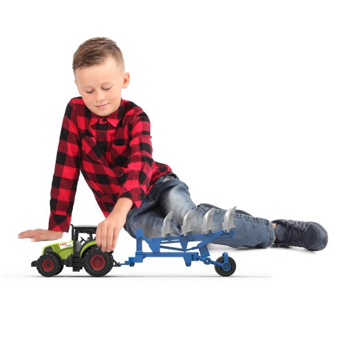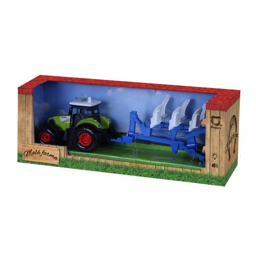 Moderní plastový traktor s přívěsem pro orbu, hračka z kolekce Moje malá farma. Nepostradatelný pomocník pro každého malého farmáře! Přívěs můžeš odpojit a traktor využít k dalším pracím. Traktor jezdí na setrvačník a jeho délka včetně přívěsu je 37 cm. Zmáčknutím tlačítek traktor vydává reálné zvuky. Traktor vyžaduje 3 ks baterií typu AG13/LR44, které jsou součástí balení.