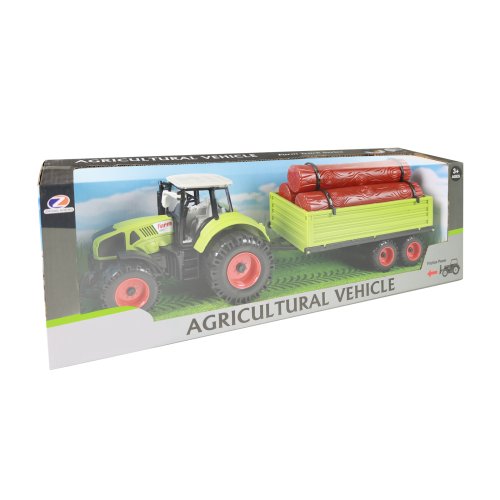 Moderní plastový farmářský traktor s vlečkou na dřevo. Vlečka se dá jednoduše odpojit a klády sundat. Traktor jezdí na setrvačník a jeho délka činí 19 cm. Vlečka jezdí na volný chod a je v délce 22 cm. Celková délka této soupravy je cca 45 cm.