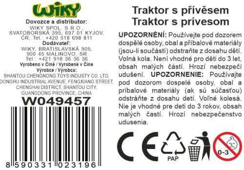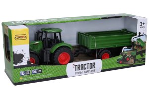 Traktor s přívěsem volná kola. Rozměry 42x10,5x13 cm. Dvířka přívěsu je možné vyklopit.