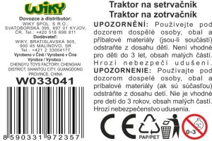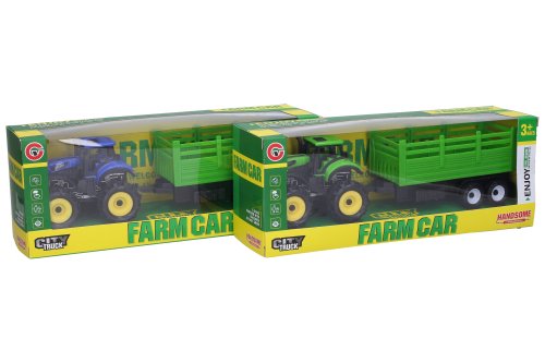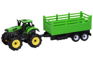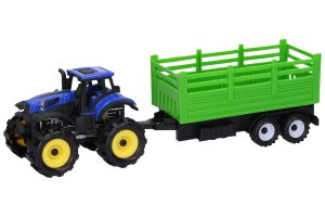Traktor s vlečkou. Rozměry 27,5x7x7,5 cm. Na setrvačník. 2 varianty - modrá, zelená.