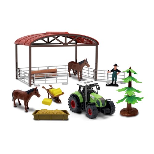 Co takhle si postavit vlastní výběh s ohradou pro koně? S touto sadou máš ideální příležitost. K postavení tvé malé farmy dostaneš oplocení, přístřešek pro koně, seno, traktor a také farmáře, který se ti bude strat o tvou farmu. V balení najdeš samozřejmě postavičky koně a další doplňky. Stlačením některého ze tří tlačítek na střeše traktoru vydává reálný zvuk spolu se světelným efektem. Traktor jezdí na setrvačník obsahuje 3 ks baterií typu AG13/LR44.