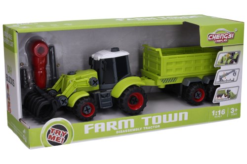 Traktor šroubovací nakladač s návěsem set. Rozměry s návěsem 40x13,5x12 cm. Obsah balení - traktor, návěs, sada nářadí na šroubovaní. Na setrvačník.