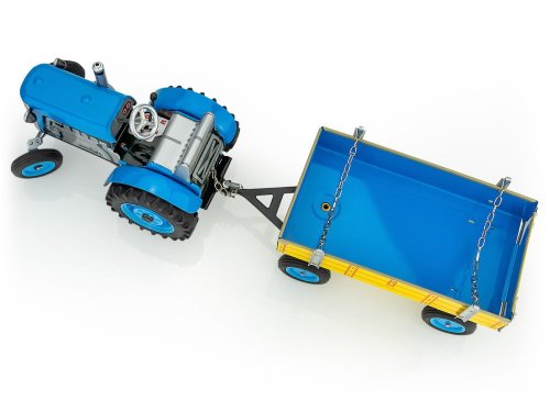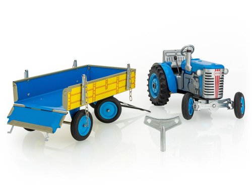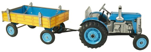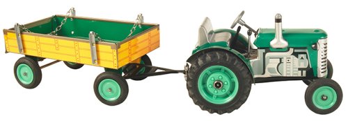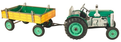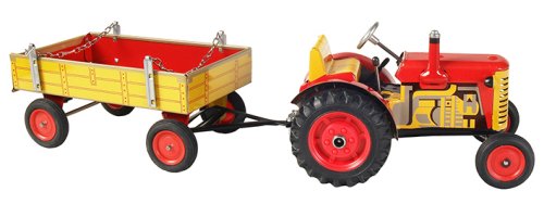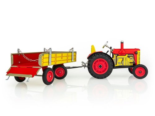 Traktor Zetor s valníkem červený od značky Kovap. Pohyb traktoru zajišťuje unikátní pérový strojek natahovaný klíčkem. Funkční převodovka má tři rychlosti dopředu a zpátečku. Traktor lze volantem skutečně řídit a navíc ho i zabrzdit ruční brzdou. Měřítko 1:25. Rozměry balení 30 x 9 x 9 cm. Vhodné pro děti od 3 let.