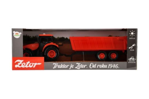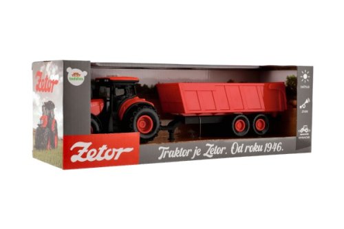 Krásný model zemědělského traktoru Zetor s dlouholetou tradicí, kterou musí milovat snad každý. Vyražte na pole s pořádným traktorem se světlem a zvukem! Traktor s valníkem je nepostradatelný pomocník pro každého malého farmáře! Valník můžeš jednoduše odpojit a traktor využít k dalším pracím. Traktor jezdí na setrvačník. Zmáčknutím tlačítek traktor vydává reálné zvuky a svítí mu světla. Hračka je na baterie 3x AG13, které jsou součástí balení. Velkost traktoru s valníkem: 36 cm Rozměr krabice: 39x13x13 cm Vhodné pro děti od 3 let