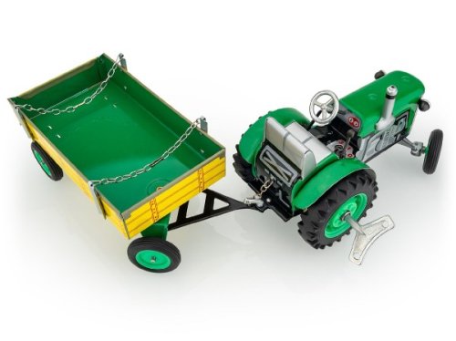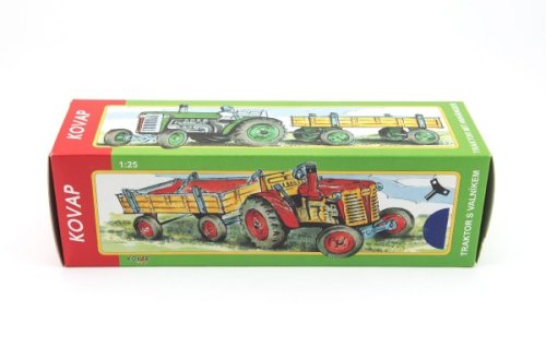 Traktor Zetor s valníkem zelený od značky Kovap. Pohyb traktoru zajišťuje unikátní pérový strojek natahovaný klíčkem. Funkční převodovka má tři rychlosti dopředu a zpátečku. Traktor lze volantem skutečně řídit a navíc ho i zabrzdit ruční brzdou. Měřítko 1:25. Rozměry balení 30 x 9 x 9 cm. Vhodné pro děti od 3 let.