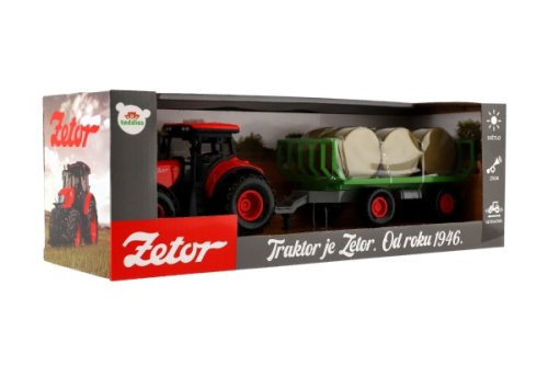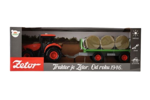 Krásný model zemědělského traktoru Zetor s dlouholetou tradicí, kterou musí milovat snad každý. Vyražte na pole s pořádným traktorem se světlem a zvukem! Traktor s vlekem na seno je nepostradatelný pomocník pro každého malého farmáře! Vlek můžeš jednoduše odpojit a traktor využít k dalším pracím. Traktor jezdí na setrvačník. Zmáčknutím tlačítek traktor vydává reálné zvuky a svítí mu světla. Hračka je na baterie 3x AG13, které jsou součástí balení. Velkost traktoru s valníkem: 36 cm Rozměr krabice: 39x13x13 cm Vhodné pro děti od 3 let