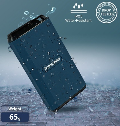 Transcend's matchbox-sized ESD410C features an incredibly rugged and water-resistant construction. An integrated lanyard hole allows for a wide range of attachment options. ESD410C's IPX5 rating and MIL-STD-810G US military drop-test compliance means that you can rest assured that your data is fully protected against the elements, even enduring a 3-meter drop!**