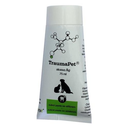 Zubní pasta s obsahem nanostříbra. TraumaPet stoma Ag zubní pasta je určena pro malá zvířata, především psy, k provádění preventivní hygieny ústní dutiny a podporu léčby zánětů ústní dutiny. TraumaPet stoma Ag je veterinární přípravek pro čištění zubů s obsahem nanostříbra. Dlouholeté výzkumy a konkrétní aplikace prokázaly antimikrobní a protizánětlivé účinky stříbra. Zubní pasta pro psy má výborné abrazivní účinky pro odstranění plaku. Jemná masová příchuť, která učiní z čištění zubů příjemný zážitek. Prostředek nevykazuje toxické účinky. Složení: Aqua, Hydrated silica, Sorbitol, Glycerinum, Cellulose gum, Aroma, Potassium sorbate, Stevia rebaudiana extract, Melaleuca alternifolia leaf oil, Argentum colloidale 50 µg/g. Způsob použití: Dentální hygienu u psů provádíme pravidelně v jednodenních intervalech zubním kartáčkem s přiměřeným množstvím zubní pasty. Zubní kartáček volíme vždy měkký, velikostně odpovídající ošetřovanému jedinci. Množství pasty je dáno velikostí jedince a nemá být příliš veliké.