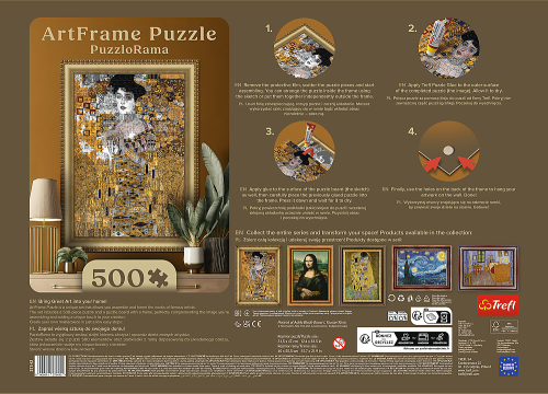 500 dílků, nákres usnadňující skládání, estetický rámeček, systém pro montáž na stěnu.