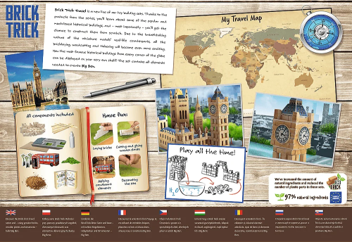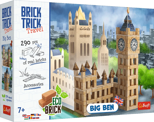 Postavte symbol Velké Británie - hodinovou věž Big Ben ze skutečných cihel a dekorativních prvků. S produkty z řady Brick Trick Travel se seznámíte s některými populárními a oblíbenými památkami a hlavně získáte možnost postavit si je od základů. Skládejte cihlu za cihlou, řežte a lepte prkénka, postupujte od základů až po dokončenou budovu a nakonec svůj výtvor ozdobte přiloženými dekoracemi. Stavte krok za krokem podle návodu nebo najděte a zrealizujte své vlastní řešení. Oživte svou dokončenou stavbu papírovými figurkami. Pokud spojíte několik sad TREFL Brick Trick, můžete vytvořit malebnou vesničku, moderní město nebo středověkou osadu. Stavebnici lze používat opakovaně (lepidlo je rozpustitelné vodou). Úroveň obtížnosti: 5,5 Balení obsahuje: - více než 290 přírodních hliněných cihliček - dřevěné desky - základovou desku - ozdobné prvky - samolepku - lepidlo - obrázkový návod Stavebnice Brick Trick od výrobce TREFL zlepšují zručnost, rozvíjí představivost a podporují soustředění.