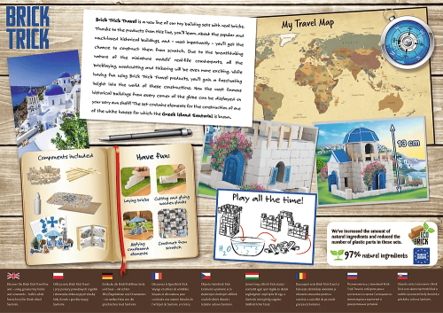 Postavte domek typický pro Santorini ze skutečných cihel a dekorativních prvků. S produkty z řady Brick Trick Travel se seznámíte s některými populárními a oblíbenými památkami a hlavně získáte možnost postavit si je od základů. Skládejte cihlu za cihlou, řežte a lepte prkénka, postupujte od základů až po dokončenou budovu a nakonec svůj výtvor ozdobte přiloženými dekoracemi. Stavte krok za krokem podle návodu nebo najděte a zrealizujte své vlastní řešení. Oživte svou dokončenou stavbu papírovými figurkami. Pokud spojíte několik sad TREFL Brick Trick, můžete vytvořit malebnou vesničku, moderní město nebo středověkou osadu. Stavebnici lze používat opakovaně (lepidlo je rozpustitelné vodou). Balení obsahuje: - více než 210 přírodních hliněných cihliček - dřevěné desky - základovou desku - ozdobné prvky - lepidlo - obrázkový návod Stavebnice Brick Trick od výrobce TREFL zlepšují zručnost, rozvíjí představivost a podporují soustředění.