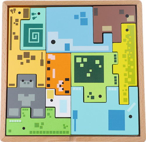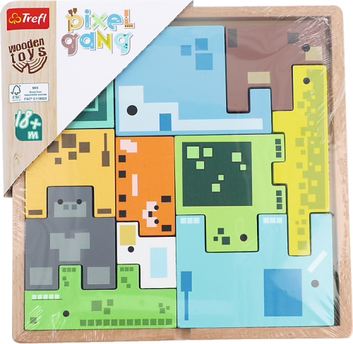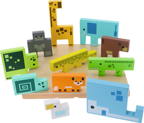 Dřevěná hlavolamová skládačka s dílky ve tvaru zvířátek v moderním pixelovém designu. Pojmenovávejte jednotlivá zvířátka a ukládejte je podle obrysů, dokud nebudou všechna schovaná v krabičce.