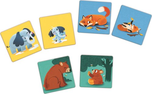 krásně ilustrované obrázky zvířátek a jejich mláďat velké kartonové kartičky o velikosti 10 cm vhodné pro velmi malé děti zábavné procvičení paměti a koncentrace 12 párů (24 kartiček) baleno v krabičce s uchem pro snadné přenášení