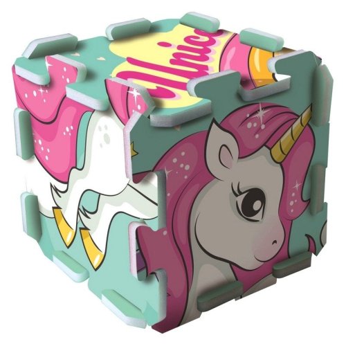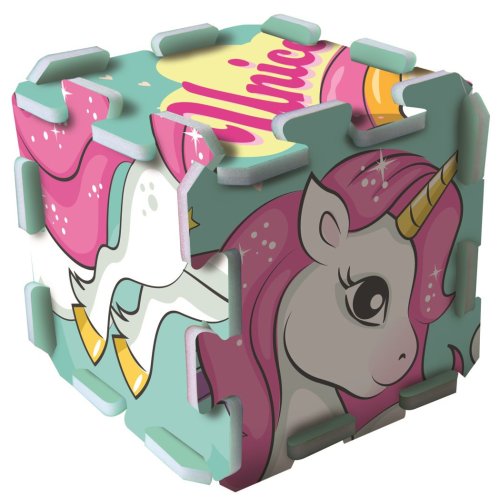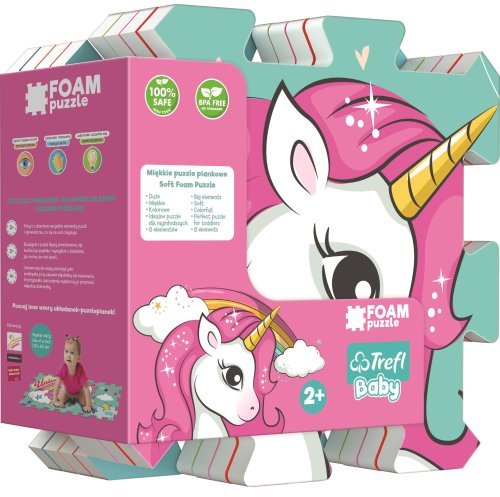 Pěnové puzzle s motivem roztomilého jednorožce. Pěnová podložka je vyrobena ze speciálního materiálu (nejedná se o klasickou vroubkovanou EVA pěnu, ale o materiál podobný silné karimatce nebo několikavrstvému mirelonu). Má nadstandardní tloušťku 1,5 cm a je určena zejména ke hraní. Puzzle je měkké, omyvatelné, zdravotně nezávadné, je lehce manipulovatelné a skladné. Z jednotlivých dílů lze poskládat kostka, tunel pro autíčka, nebo jej lze použít jako krásnou dekoraci na stěnu. Z osmi samostatných dílů lze vytvořit plochu přibližně 117 x 60 cm. Pěnové puzzle TREFL PUZZLOPIANKA je vhodné také jako podložka při hraní s plastelínou nebo malování barvičkami. Po použití puzzle jednoduše otřete vlhkým hadříkem. Doporučeno pro děti od 2 let.