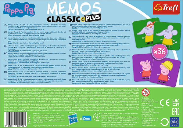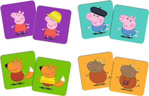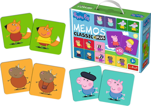Čtyři paměťové hry s různými stupni obtížnosti. Začněte od nejjednodušší varianty a propracujte se k novým výzvám. 4 varianty pexesa s postavičkami z animovaného seriálu Prasátko Peppa, velké kartonové kartičky, zábavné procvičení paměti a koncentrace, baleno v krabičce s uchem pro snadné přenášení Obsah balení: 36 kartiček, dřevěná figurka, návod