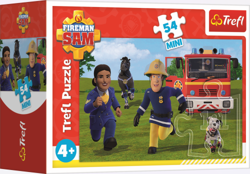 Mini-Puzzle (dílky 2,2 cm, baleno v malé krabičce) ze série Požárník Sam. Rozměr složeného puzzle cca 20 x 13 cm