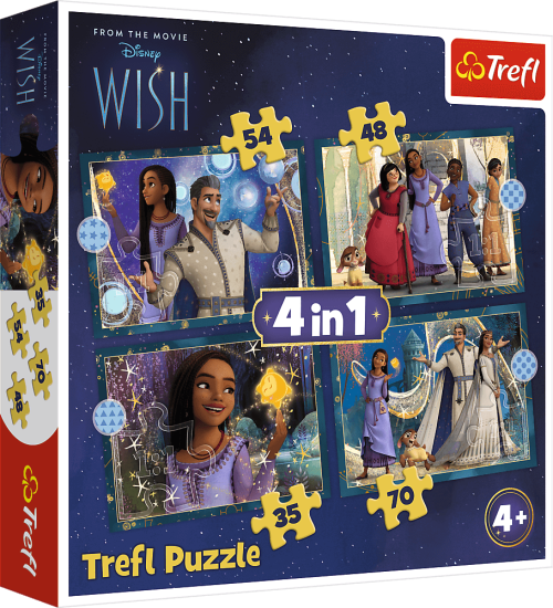 Progresivní puzzle s různou obtížností - 4 puzzle se 35 - 70 dílky, s vyšším počtem dílků se zmenšuje jejich velikost. Rozměr složeného puzzle cca 28,5 x 20,5 cm