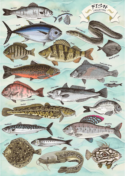 TREFL Finders Keepers: Ryby představují barevnou galerii ryb, připomínající podmořský lexikon — každá z nich je pečlivě ilustrovaná a popsaná, jako by tě zvala k objevování tajemství mořských hlubin, aniž bys musel opustit domov. Puzzle je součástí výjimečné série, která tě přenese do světa, kde je možné úplně všechno a kde krásné, živé obrazy doslova berou dech. Rozměr složeného puzzle cca 34 x 48 cm