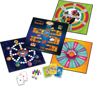 33 zábavných společenských her, 2 oboustranné herní desky, 8 barevných dřevěných herních figurek, 2 dřevěné kostky, 107 karet, 1 pravidla her.