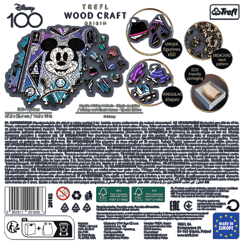 vysoká kvalita a precizní zpracování laserem až 50 unikátně tvarovaných dílků ve tvaru budov, předmětů a zvířat ostatní dílky v nepravidelných tvarech puzzle je oboustranné - z jedné strany obrázek, z druhé strany vzor ekologické balení - zcela bez plastových obalů