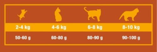Nutriční doplňkové látky v 1 kg: Vitamín A 20.000 mj, Vitamín D3 2.000 mj, Vitamín E (alfatokoferol) 160 mg, Železo (monohydrát síranu železnatého) 75 mg, Měď (síran měďnatý pentahydrát) 10 mg, Mangan (monohydrát síranu manganatého) 7,5 mg, Zinek (oxid zinečnatý) 150 mg, Taurin 1.000 mg, Selen 0,15 mg.