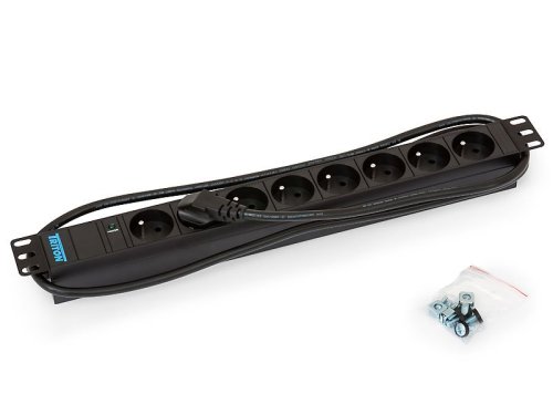 19" rozvodný panel 1U, 8x zásuvka podle ČSN, max 16A, kabel 3x1,5mm, 2m + zástrčka univezál CZ-DE max. 16A, kontrolka, RAL 9005
