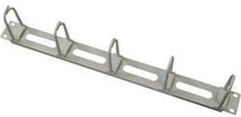 19" vyvazovací panel 1U s pěti plastovými háčky a oválnými otvory. Vhodný pro nižší zatížení.