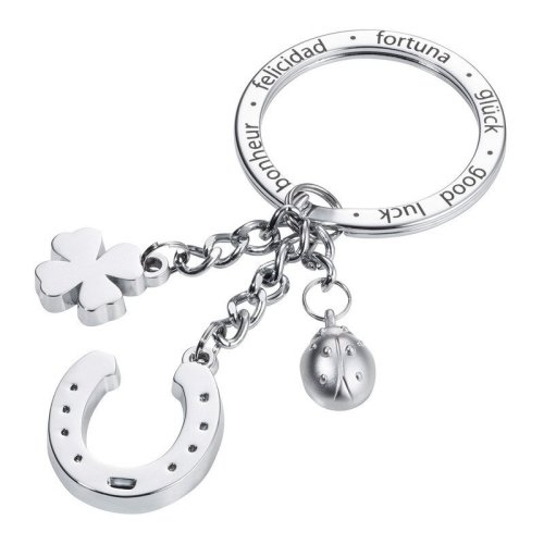 Klíčenka se 3 přívěsky - podkova, čtyřlístek a beruška. XL kroužek s rytinou „good luck“ v různých jazycích. Stříbrné provedení.<br> <br> • rozměry: 110 x 95 x 35 mm<br> • hmotnost: 32 g<br> • motiv štěstí - čtyřlístek, beruška, podkova<br> • vhodná i jako dárek<br> • XL kroužek s rytinou