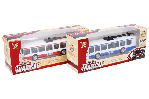 Kovový trolejbus na setrvačník. Světelné a zvukové efekty. Velikost 16 cm. 3xAG13 baterie součástí. 3 varianty - zelená, modrá, žlutá.