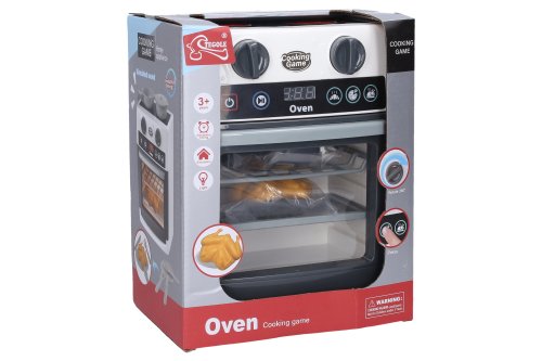 Trouba s efekty. Rozměry 20x13.8x25.5cm. světelné a zvukové efekty. Obsahuje nádobí a kuře. Ovládá se tlačítky na troubě, Tlačítko on/off troubu zapne a vybráním programu pečení se spustí odpočet. Aby trouba fungovala správně, musí mít zavřená dvířka. 3xAA baterie nejsou součástí.