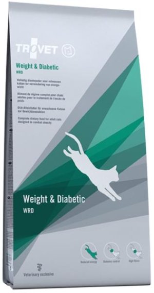Trovet WRD je kompletní, dietní krmivo pro kočky určené ke snížení nadváhy. Složení: drůbeží maso, kukuřice, rýže, kukuřičný lepek, hydrolyzovaná drůbeží játra, rybí maso, celulóza, vejce, pivovarské kvasnice, rybí olej, chlorid sodný. Analytické složky: hrubý protein 36,0 %, hrubé oleje a tuky 8,5 %, hrubý popel 7,0 %, hrubá vláknina 4,5 %, vlhkost 8,0 %, uhlohydráty 36 %, vápník (Ca) 1,20 %, fosfor (P) 1,10 %, draslík (K) 0,60 %, sodík (Na) 0,45 %, hořčík (Mg) 0,08 %. Doplňkové látky (v kg): Nutriční doplňkové látky: Vitamíny: vitamin A 15000 MJ/kg, vitamin D3 1000 MJ/kg, vitamin 250 MJ/kg, L-karnitin 150 mg/kg, taurin 1800 mg/kg. Stopové prvky: síran zinečnatý monohydrát (Zn) 85 mg/kg, síran železnatý monohydrát (Fe) 75 mg/kg, oxid manganatý (Mn) 15 mg/kg, pentahydrát síranu měďnatého (Cu) 10 mg/kg, jodičnan vápenatý bezvodý (I) 2 mg/kg, seleničitan sodný (Se) 0,15 mg/kg. Obsahuje antioxidanty. Dávkování: