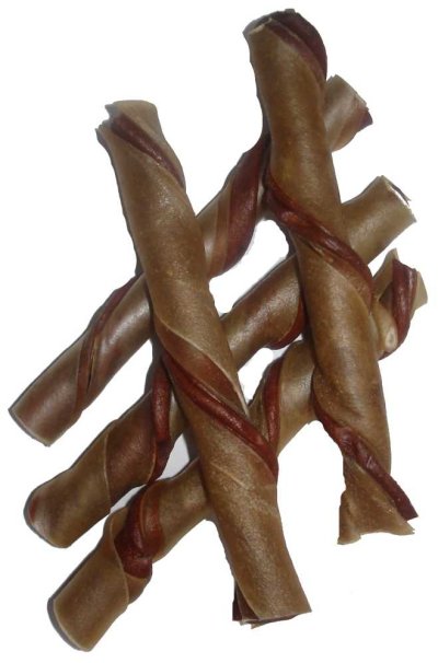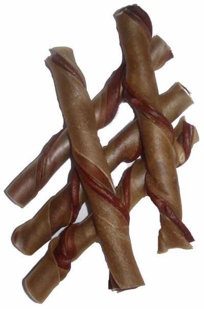 Bezlepková pochoutka pro psy ve tvaru trubiček s kuřecí příchutí.