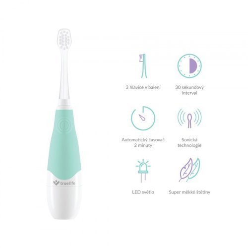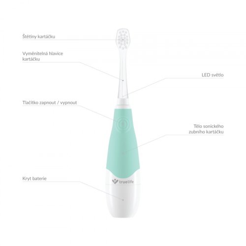 Na pravidelnou péči o zoubky by si měly zvykat i nejmenší děti. Ovšem přesvědčit vaše dítě, aby si dobrovolně čistilo zuby, může být občas oříšek. Většina dětí si čištění zubů příliš neužívá a tak ho často jen tak odbyde. Se sonickým kartáčkem Truelife SonicBrush Baby G, který je uzpůsoben potřebám dětí od 3 do 6 let, může být ale čištění zubů i zábava. Díky 30 samolepkám zvířátek a zábavné výukové video animaci snadno proměníte rutinní činnost v legraci a vaše dítě se bude na čištění zubů těšit. Kartáček je plně přizpůsoben dětským potřebám, tělo i hlavice kartáčku mají vhodnou velikost pro dětská ústa a štětiny kartáčku jsou pro děti dostatečně jemné. Kartáček je napájen z obyčejné AAA baterie, takže s ním můžete pohodlně cestovat.
