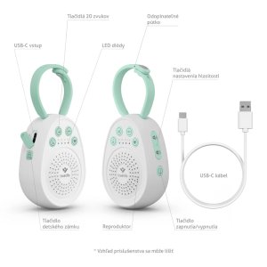 Doma i na cesty Přenosný uspávací modul výborně poslouží k uspávání miminka doma i na cestách. Pomocí odnímatelného poutka jej jednoduše zavěsíte na postýlku, kočárek nebo sedačku v autě. Právě při cestování autem oceníte, že stačí jediný pohyb ke spuštění ukolébavky, a tedy klidnější jízdu. Baterie vydrží až dlouhých 100 hodin, takže se není třeba obávat, že by v nevhodnou chvíli přestal usínáček fungovat. Následně stačí dobít pomocí USB-C.