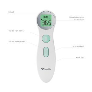 Přesné, rychlé a pohodlné měření S teploměrem TrueLife Care Q6 nemusíte dlouho čekat, výsledek měření se dozvíte do 1 sekundy od stisknutí tlačítka. Teploměr využívá technologii infračerveného záření a teplotu měří s přesností na 0,1 °C. Bezkontaktní měření je navíc naprosto hygienické a zároveň i pohodlné, teploměr stačí namířit do středu čela a stisknout tlačítko. Pokud potřebujete změřit teplotu dítěti, klidně může zůstat spát a ani nemusíte rozsvěcet světlo. LCD displej má barevné podsvícení a při zvýšené teplotě vás upozorní červené podsvícení.